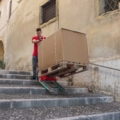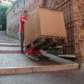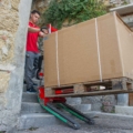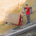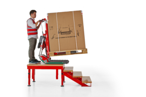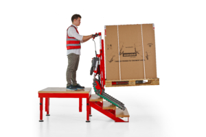 Mit Domino PT nehmen Sie die Palette auf und fahren die Treppe hinauf. Einfach und sicher.